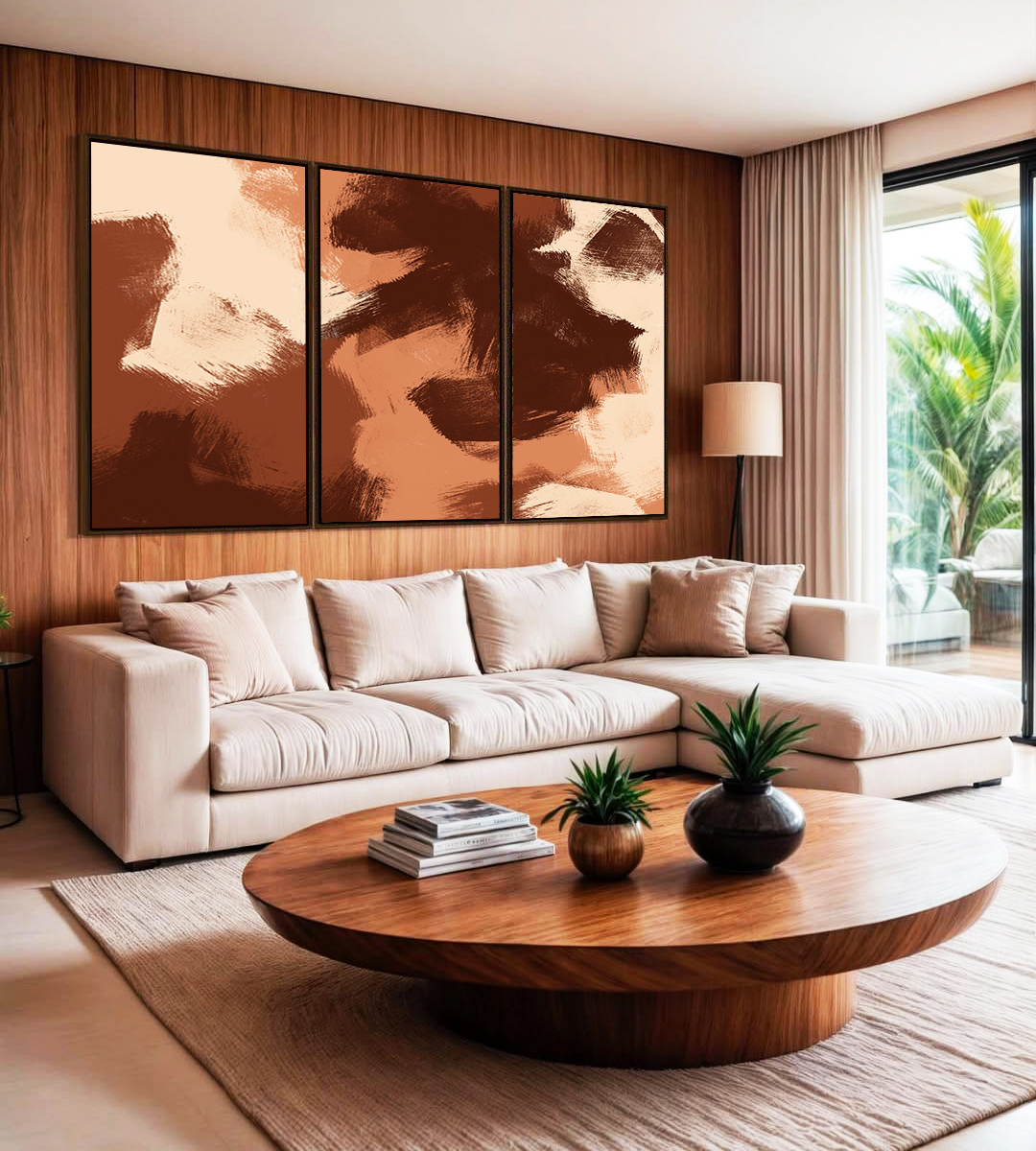 Com efeito de pintura em tons marrom e pêssego, este Trio de Quadros adiciona calor, estilo e elegância discreta ao ambiente.