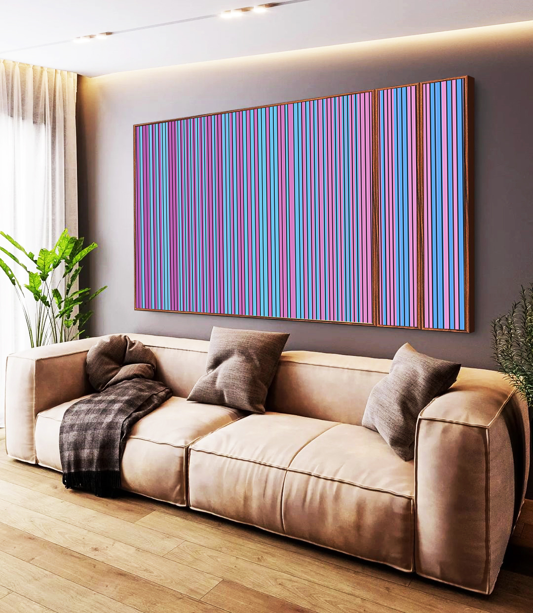 Elegante e moderno, este Trio de Quadros Estilizados com listras em degradê azul e lilás cria um ponto focal delicado e sofisticado. Ideal para compor salas contemporâneas, quartos refinados, escritórios elegantes ou halls de entrada marcantes.