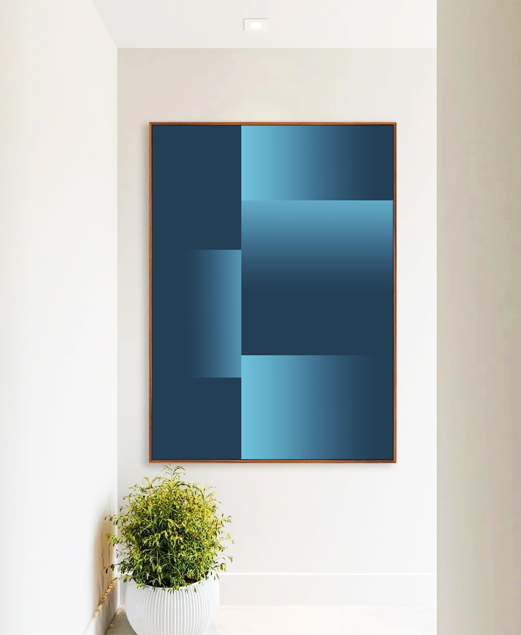 Com Arte geométrica e degradê em tons de azul, este Quadro Vertical transmite modernidade e serenidade. A escolha certa para salas amplas, quartos refinados ou halls de entrada, valorizando o ambiente com arte abstrata e visual marcante.