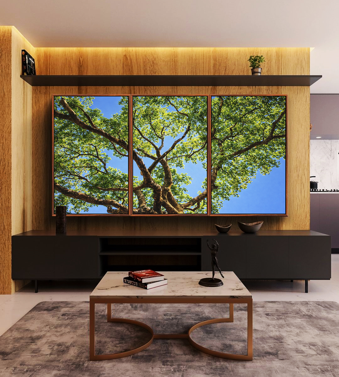 Trio de Quadros Copa de Árvore Folhas Verdes Céu Azul Vivo Natureza Canvas Moldura