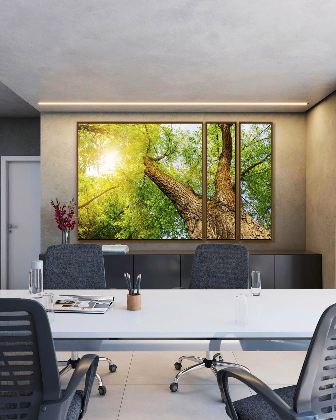Modernize seu espaço com este Trio Estilizado de Quadros da copa de uma árvore com folhas verdes iluminadas pelo sol. Perfeito para quem busca aconchego e sofisticação. Indicado para salas, escritórios e halls. Impressão em canvas premium com moldura sofisticada.
