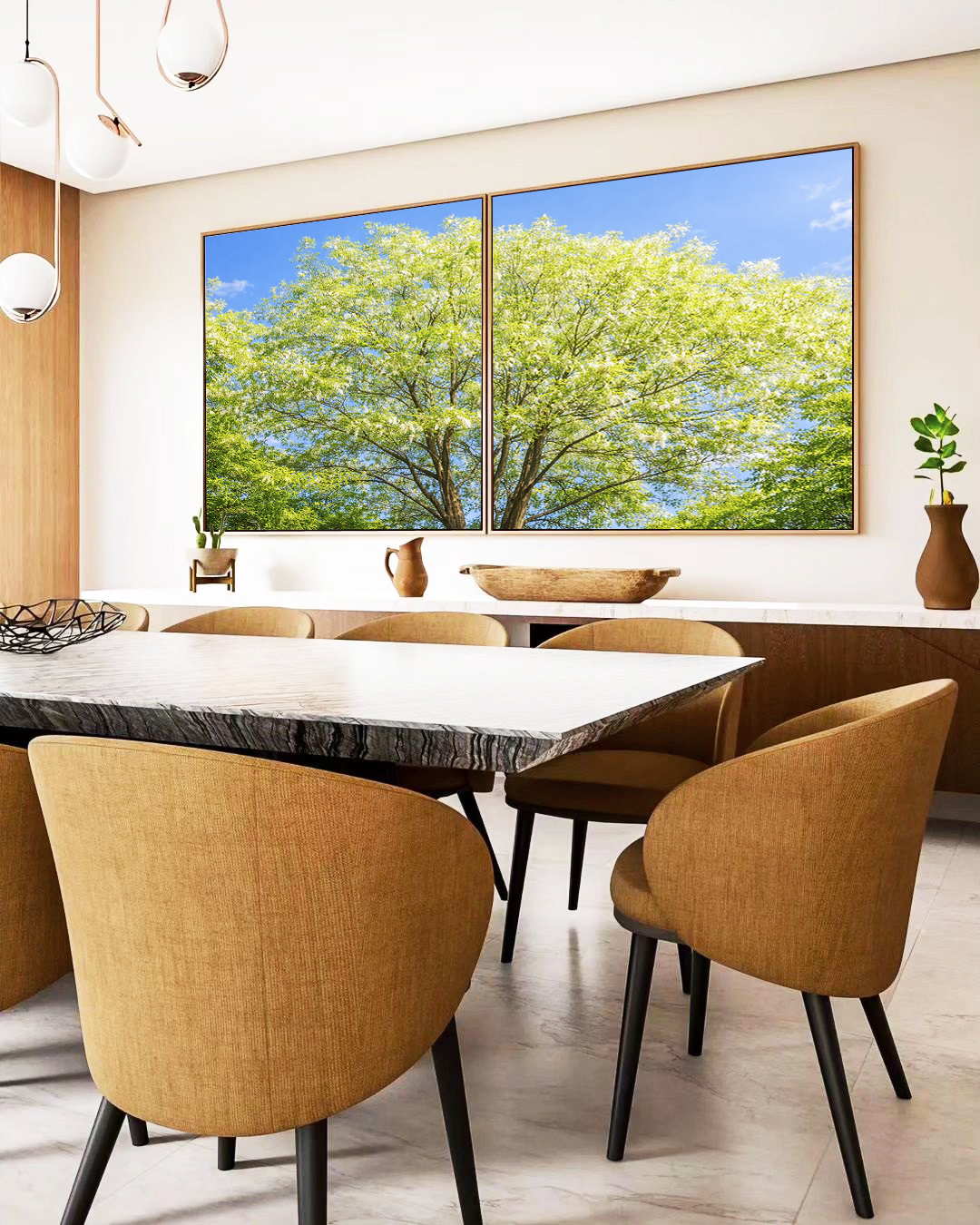 Este Duo de Quadros Quadrados que retrata uma árvore em verde claro sob um céu azul suave, transmitindo leveza e conexão com a natureza. A escolha ideal para salas sofisticadas, quartos acolhedores ou halls de entrada iluminados.