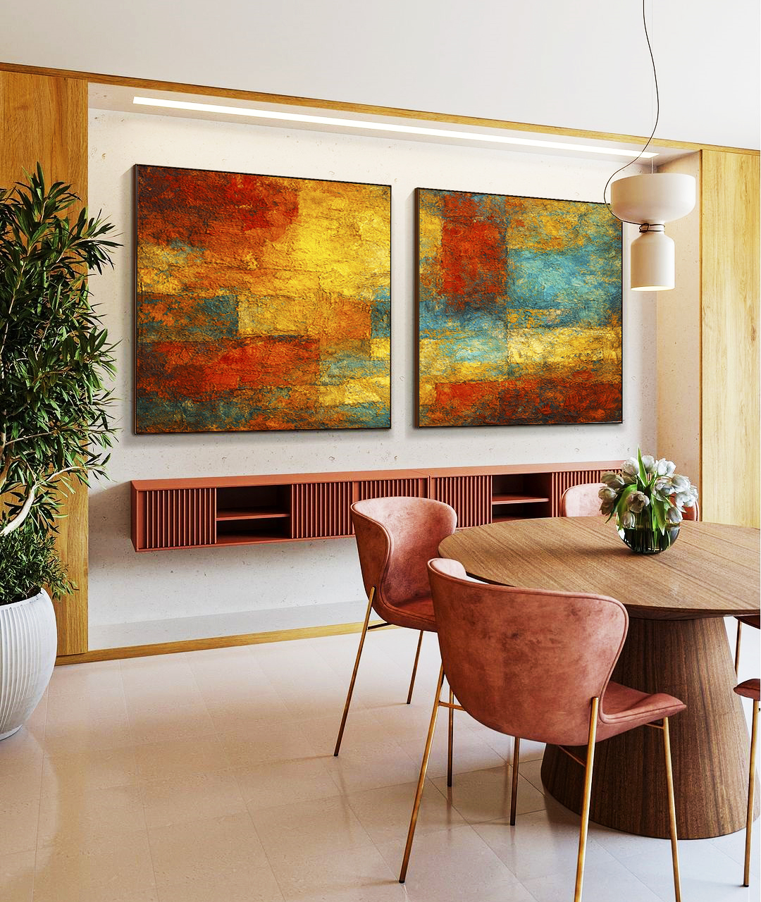 Duo de Quadros Quadrados Abstrato Textura Amarelo Laranja Turquesa Canvas Moldura