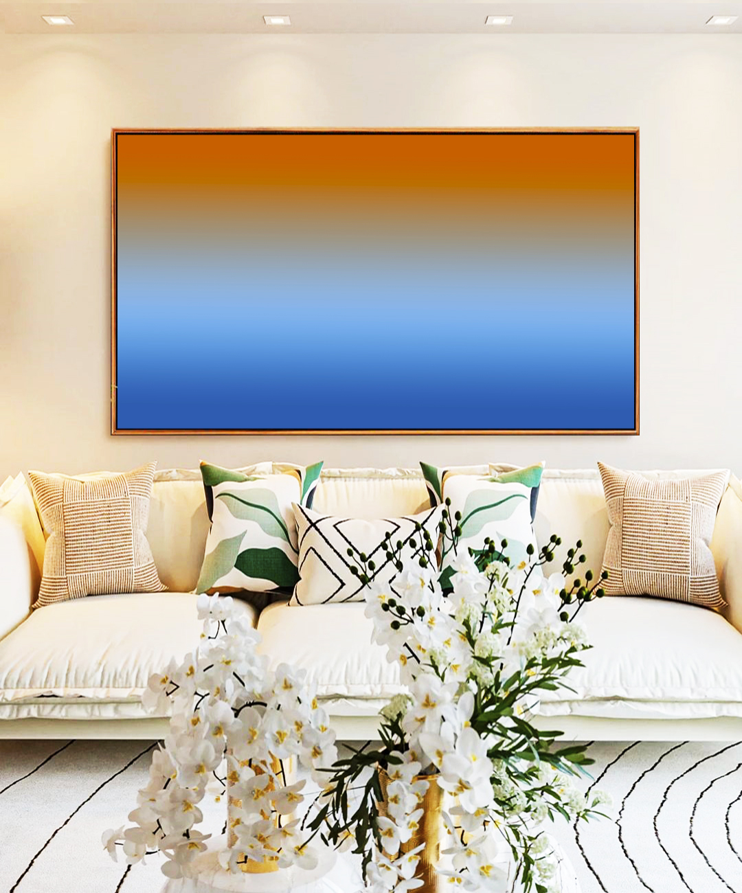 O contraste entre azul sereno e laranja vibrante traz profundidade e personalidade ao ambiente. Ideal para valorizar salas, escritórios e espaços modernos com toque sofisticado.