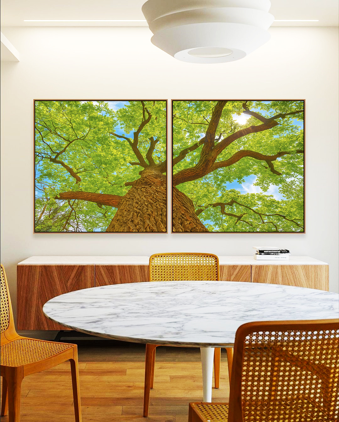 Com árvore em destaque e luz natural filtrada pelas folhas verdes, este Duo de Quadros Quadrados transmite harmonia e bem-estar. Ideal para salas amplas, escritórios ou halls de entrada, transformando o ambiente com sofisticação natural.
