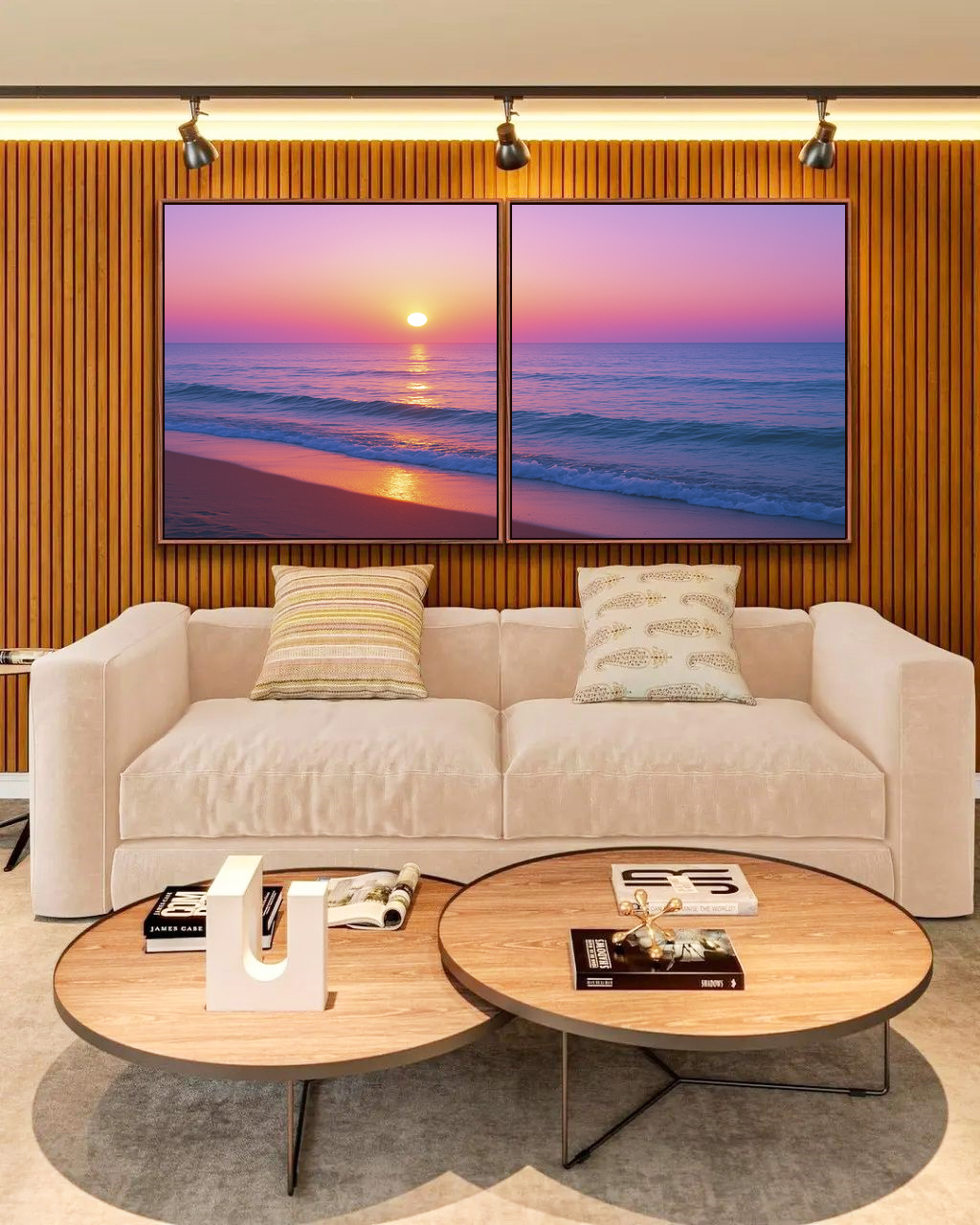 A delicadeza do pôr do sol em rosa e lilás sobre o mar calmo cria uma atmosfera de paz e beleza. Este Duo de Quadros Quadrados é perfeito para transformar salas, quartos ou escritórios em espaços acolhedores e visualmente inspiradores.