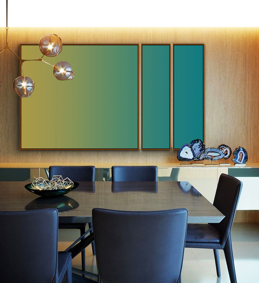 Degradê abstrato em tons de verde, azul e turquesa que ilumina o ambiente e traz sensação de calma e fluidez. O visual clean e elegante valoriza a decoração, sendo uma escolha versátil para salas, quartos e espaços modernos.