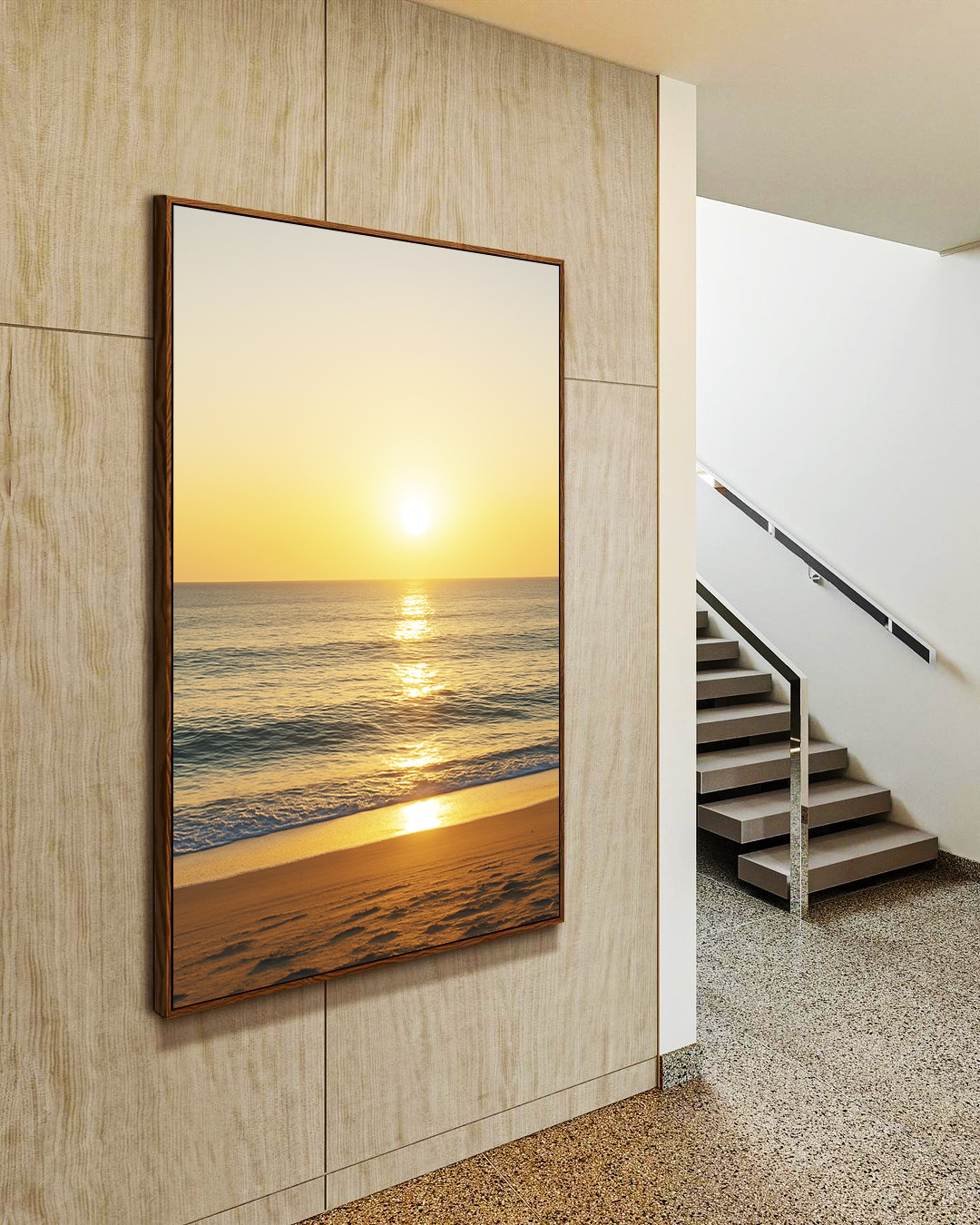 O brilho suave do sol sobre o mar prateado neste Quadro Vertical transforma o ambiente com leveza e elegância. A escolha certa para valorizar salas, quartos ou halls de entrada com uma paisagem de praia moderna, calma e inspiradora.