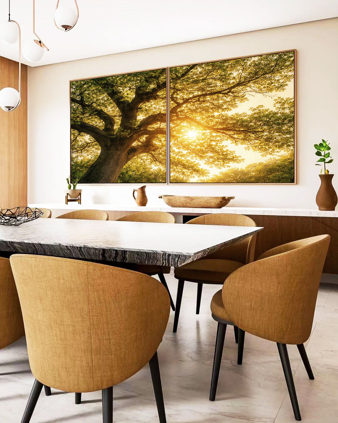 Árvore iluminada por luzes douradas do sol, criando uma atmosfera quente e serena. Ideal para sala, quarto ou ambientes que pedem aconchego, paz e conexão com a natureza.