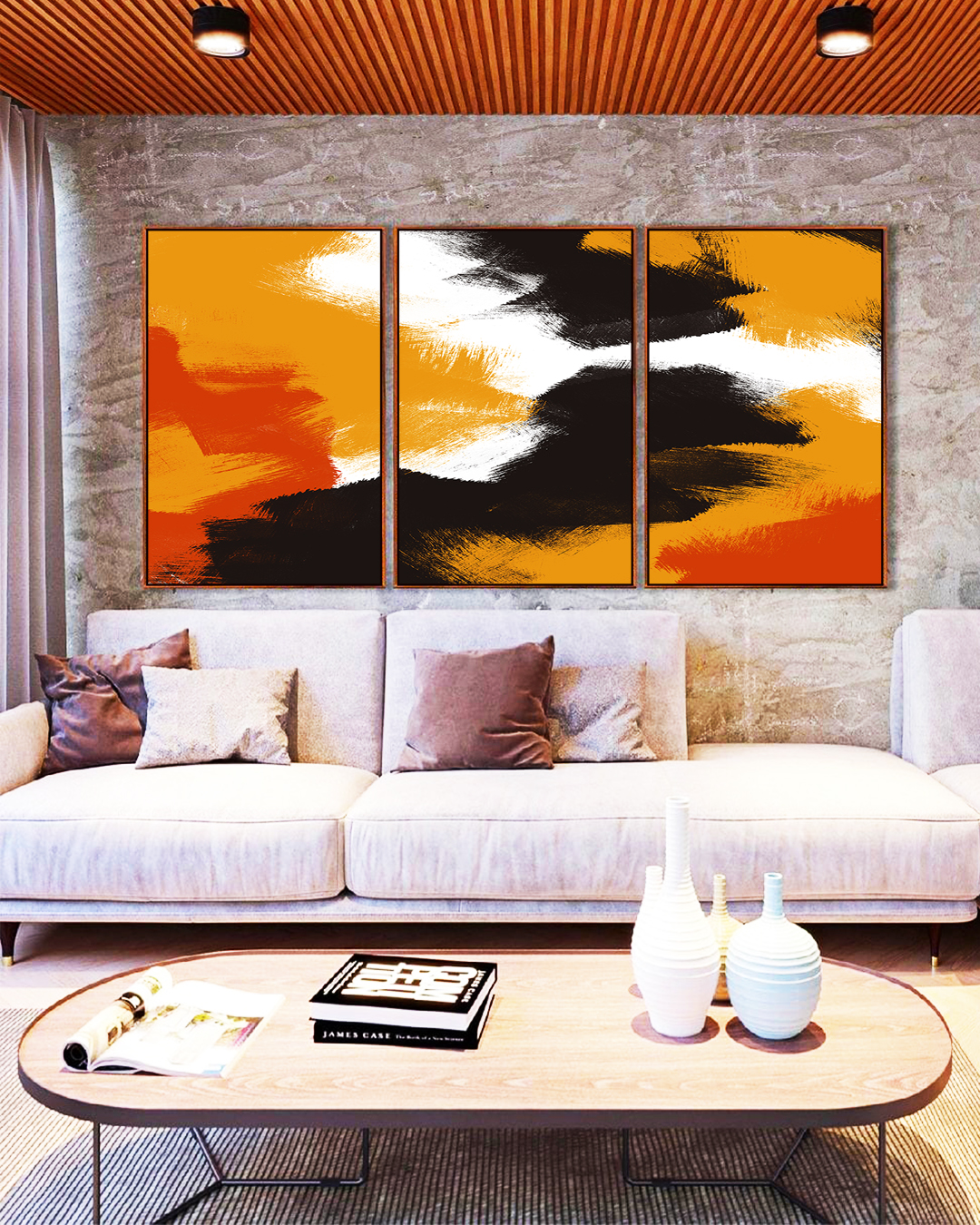 Trio de Quadros Abstrato Amarelo Laranja Abóbora Preto Efeito Pintura Canvas Moldura