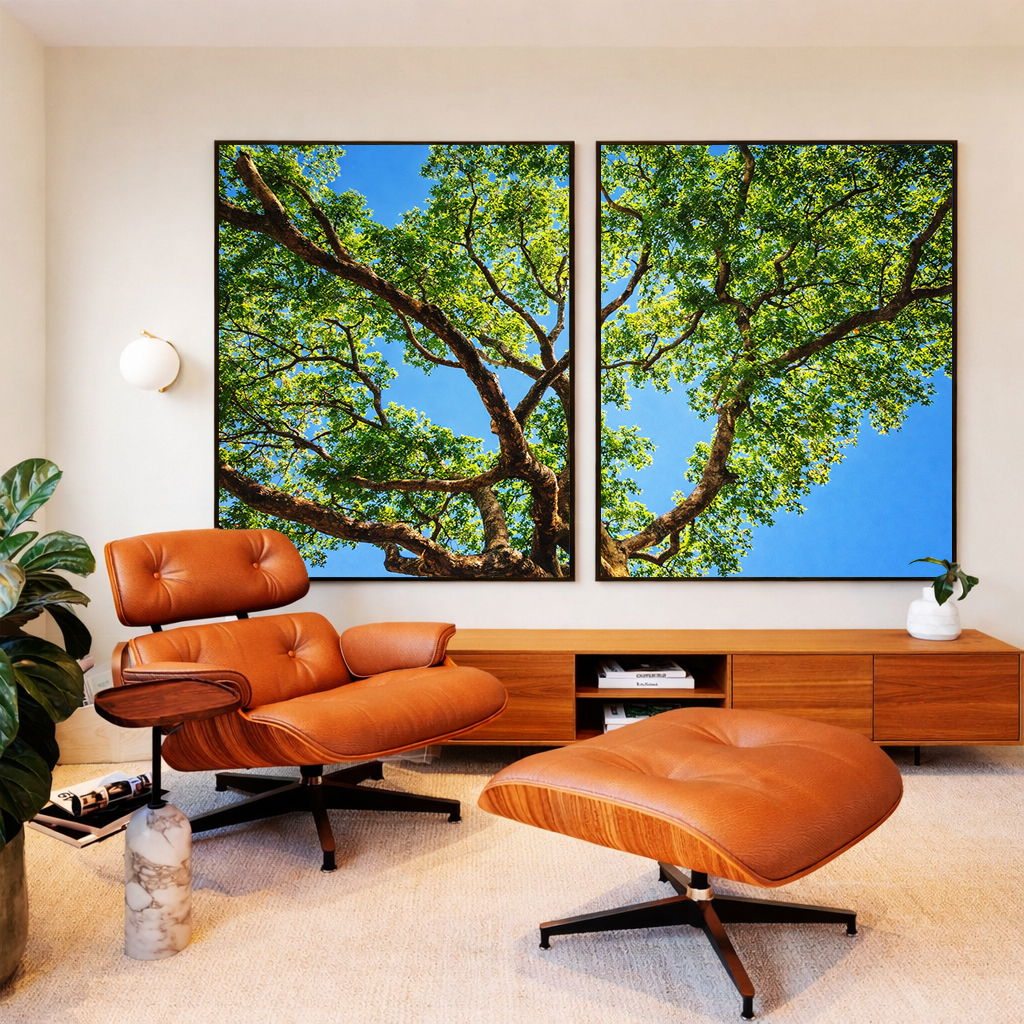 Duo de Quadros Copa de Árvore Folhas Verdes Céu Azul Vivo Natureza Canvas Moldura