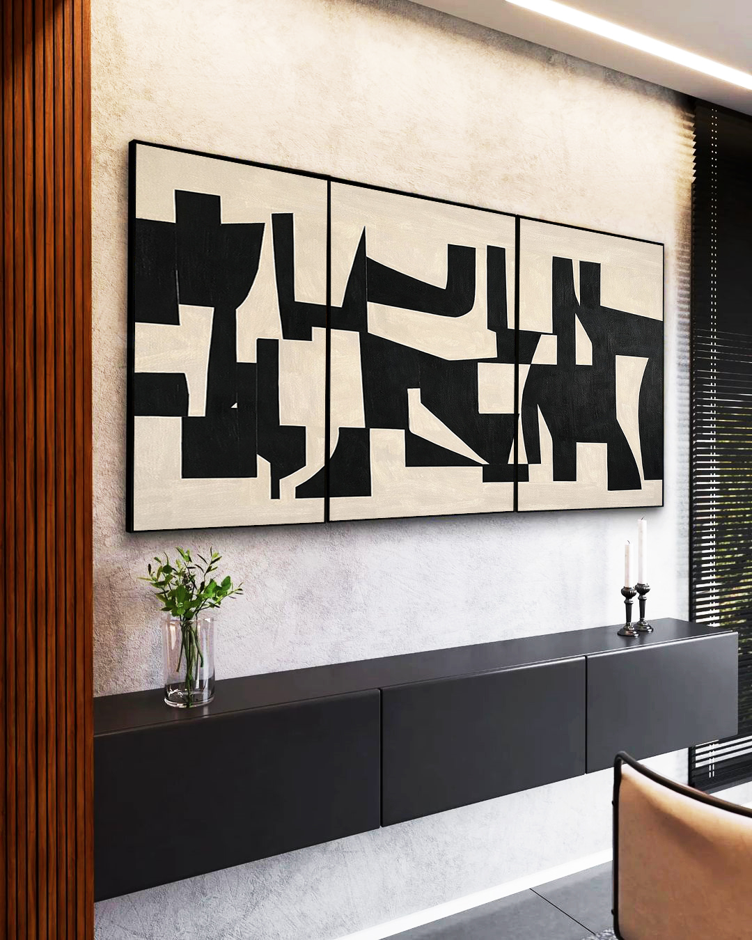 Traços minimalistas e geométricos em preto e marfim criam um visual elegante e equilibrado. Ideal para salas, escritórios e ambientes que buscam sofisticação, ordem visual e estética contemporânea.