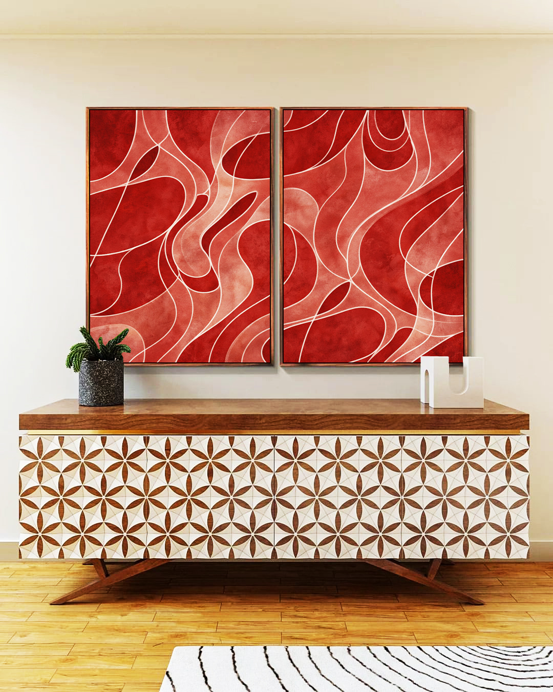 Vibrante e sofisticado, este Duo de Quadros em vermelho tijolo e salmão com contornos suaves cria contraste artístico e elegância. Ideal para decorar sua sala, quarto refinado, escritório contemporâneo ou hall de entrada imponente.