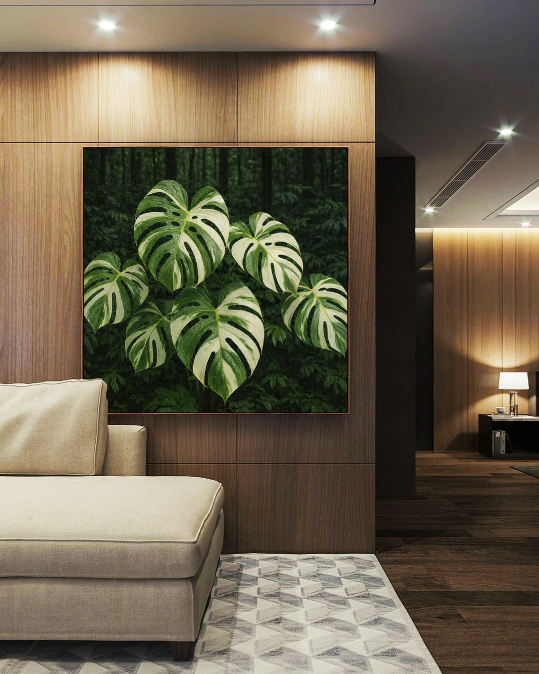 Elegante e natural, este Quadro Quadrado com plantas costela de adão em tons de verde cria frescor e sofisticação visual. Ideal para decorar salas refinadas, quartos elegantes, escritórios modernos ou halls de entrada imponentes.