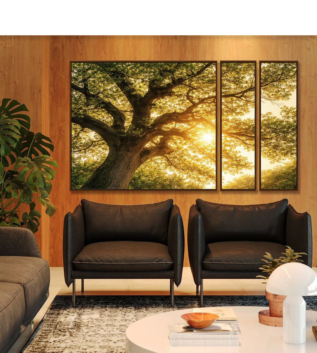 Árvore iluminada por luzes douradas do sol, criando uma atmosfera quente e serena. Ideal para sala, quarto ou ambientes que pedem aconchego, paz e conexão com a natureza.
