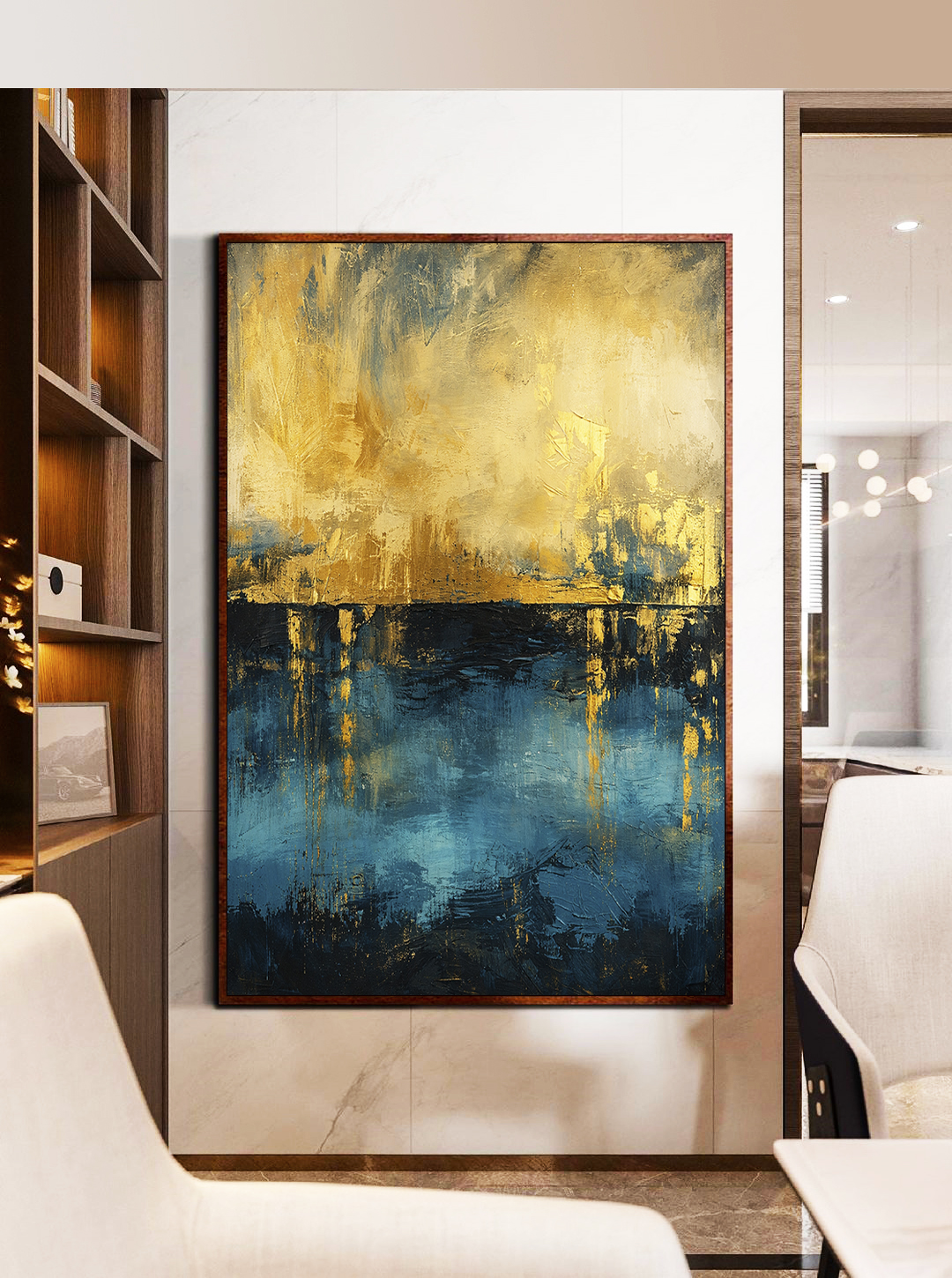 Amarelo ouro luminoso e azul petróleo profundo criam um visual marcante e sofisticado. Arte abstrata com textura elegante para salas de estar, quartos ou escritórios . Decoração moderna, contemporânea e refinada para ambientes elegantes.