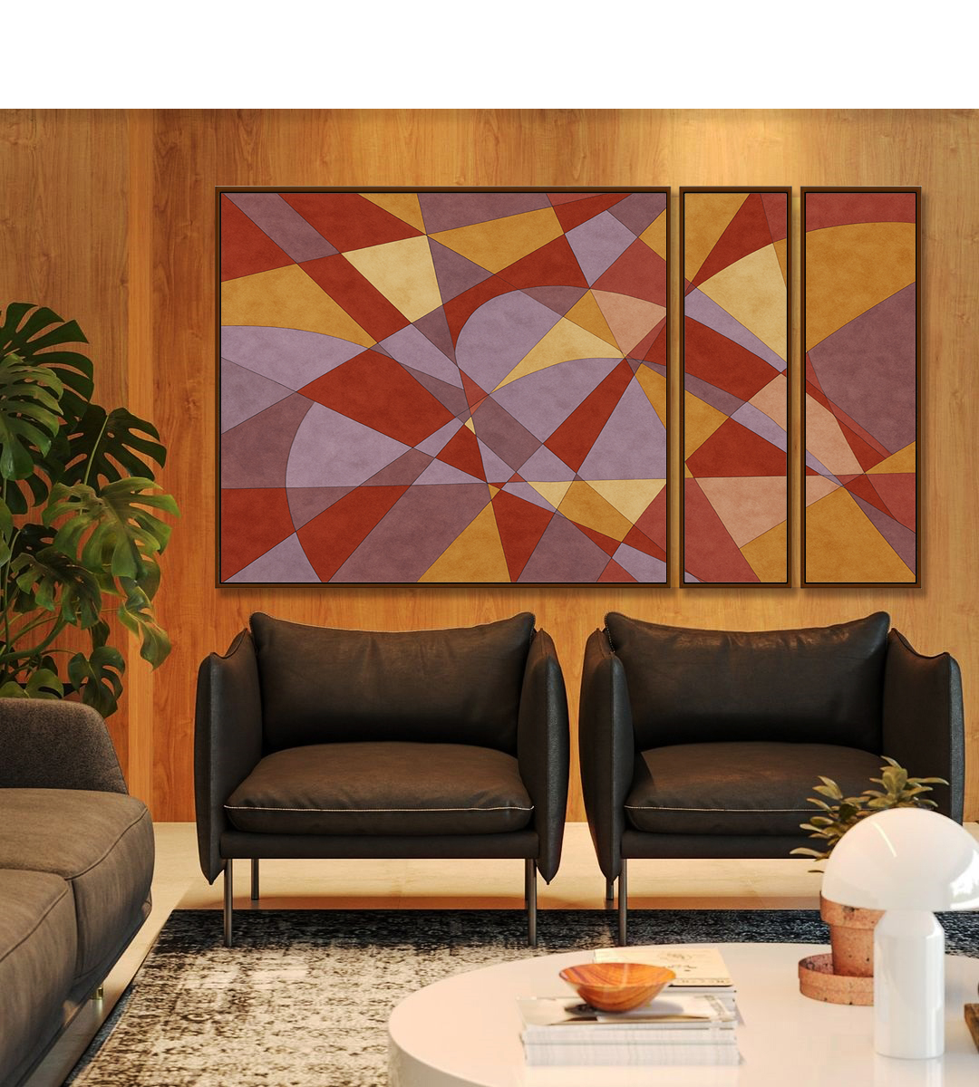 Este Trio de Quadros Estilizados em mosaico abstrato com vermelho carmim, lilás, bronze e bordô é pura elegância. Com moldura moderna, transforma salas amplas, halls ou escritórios, criando composições únicas que elevam o ambiente de forma contemporânea.