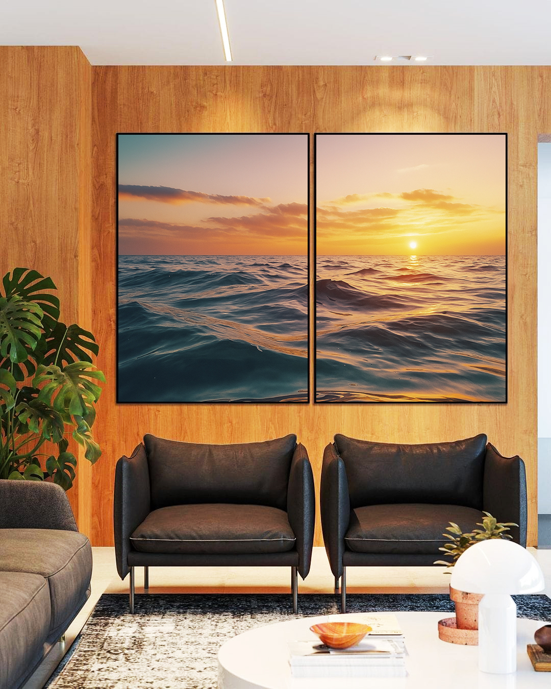 Com tons naturais e movimento suave do mar, este Duo de Quadros de pôr do sol cria um ponto focal elegante e relaxante. Ideal para compor salas contemporâneas, quartos sofisticados, escritórios profissionais ou halls de entrada marcantes.