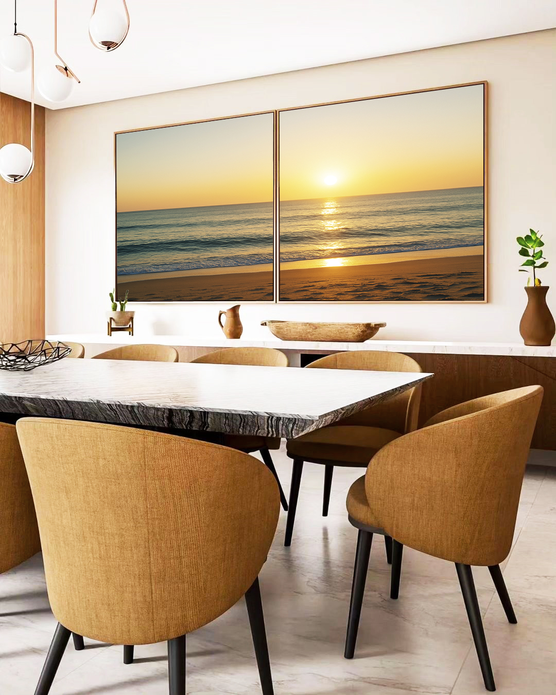 O brilho suave do sol sobre o mar prateado neste Duo de Quadros Quadrados transforma o ambiente com leveza e elegância. A escolha certa para valorizar salas, quartos ou halls de entrada com uma paisagem de praia moderna, calma e inspiradora.