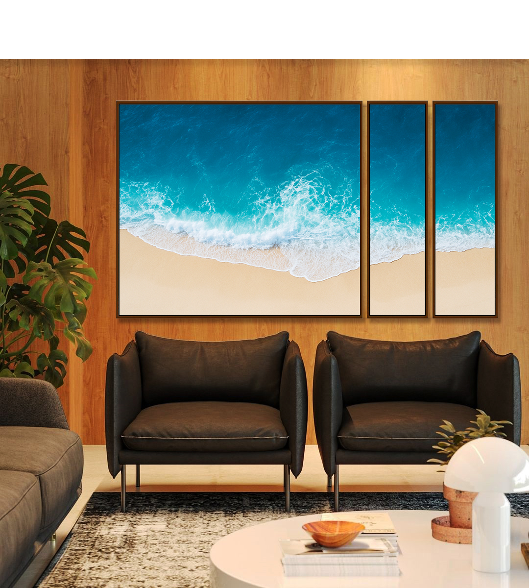 Este Trio de Quadros Estilizados Mar Calmo une a intensidade do azul oceano à suavidade da areia, criando um efeito marcante. A Moldura Moderna completa o design, ideal para trazer sofisticação à sua Sala de Estar, Quarto, Escritório ou Hall de Entrada.