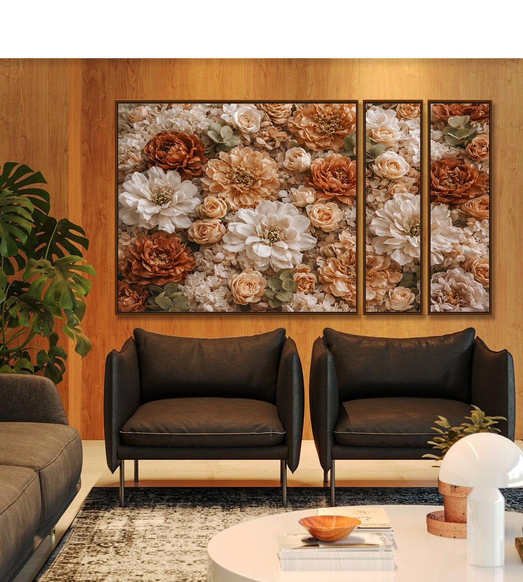 Flores exuberantes como peônias, rosas e dálias criam uma atmosfera romântica e refinada. Perfeita para salas de estar, quartos, halls e espaços que valorizam beleza, leveza e estilo atemporal.