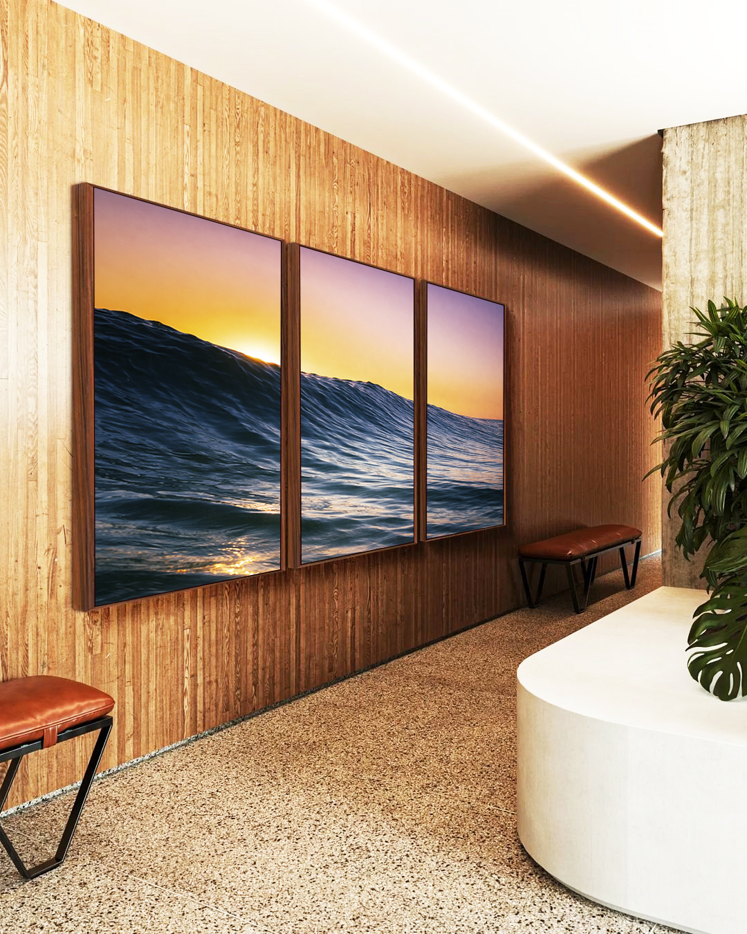 O pôr do sol sobre o mar azul ondulado cria uma atmosfera acolhedora e serena, trazendo leveza e movimento ao espaço. Ideal para salas, quartos e ambientes que buscam tranquilidade com inspiração natural.