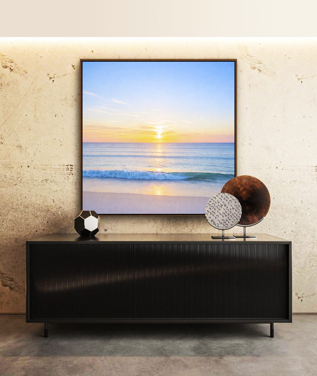 Leve e inspirador, este Quadro Quadrado retrata a natureza litorânea com mar azul claro e céu aberto ao nascer do sol, arte cheia de harmonia. A escolha ideal para quartos tranquilos, escritórios sofisticados ou salas elegantes.