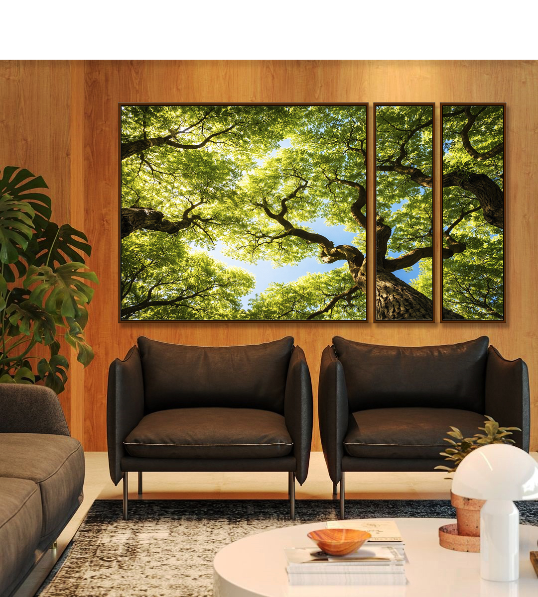 O azul do céu combinado ao verde intenso das árvores cria uma atmosfera fresca e revitalizante. Ideal para salas, quartos e ambientes que buscam sensação de leveza, bem-estar e contato com a natureza.