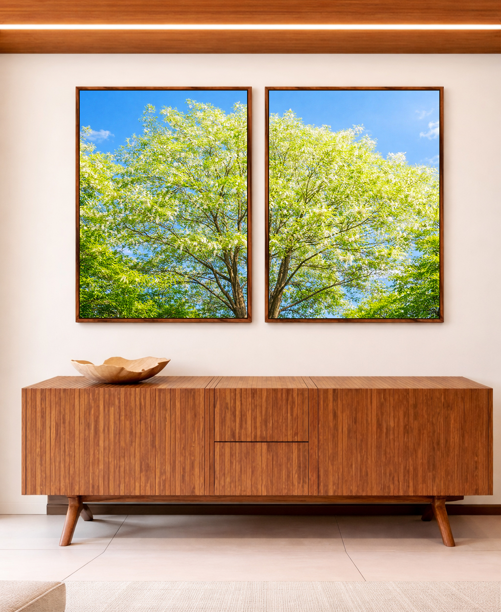 Este Duo de Quadros que retrata uma árvore em verde claro sob um céu azul suave, transmitindo leveza e conexão com a natureza. A escolha ideal para salas sofisticadas, quartos acolhedores ou halls de entrada iluminados.