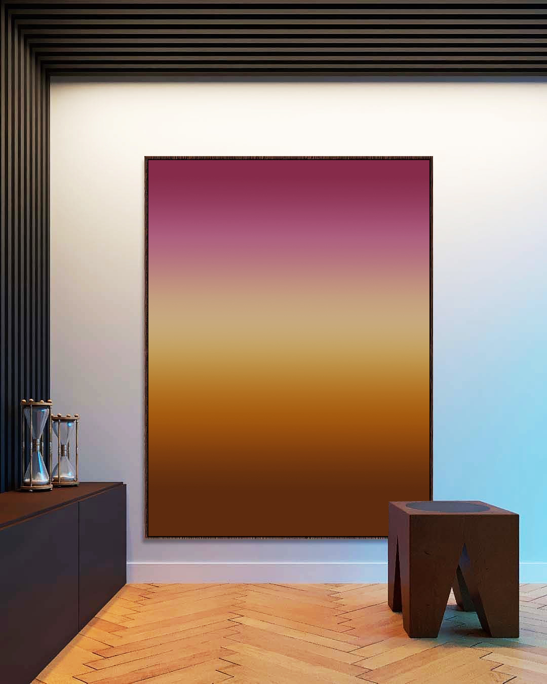 Degradê abstrato em vinho, marsala, marfim, marrom e cobre cria atmosfera sofisticada e acolhedora. Ideal para salas de estar, escritórios, hall de entrada ou quartos, valorizando decoração moderna, elegante e contemporânea.