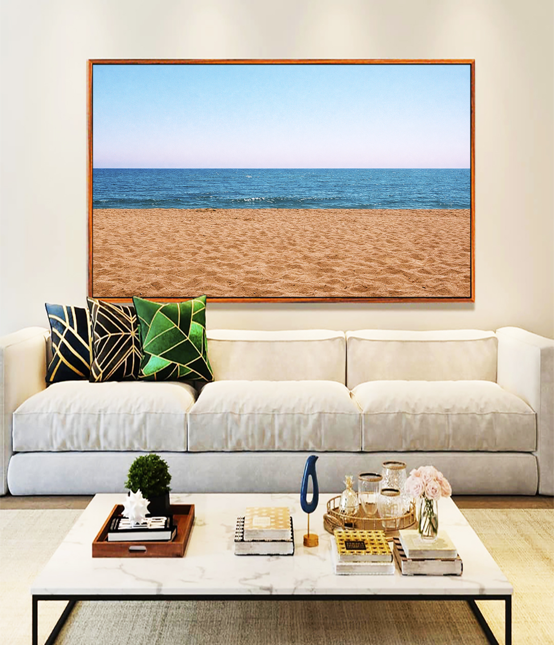 Praia e sereno, este Quadro Horizontal com areia, mar azul e céu claro transmite frescor e tranquilidade visual, criando atmosfera sofisticada. Perfeito para iluminar salas elegantes, quartos refinados ou halls de entrada acolhedores.