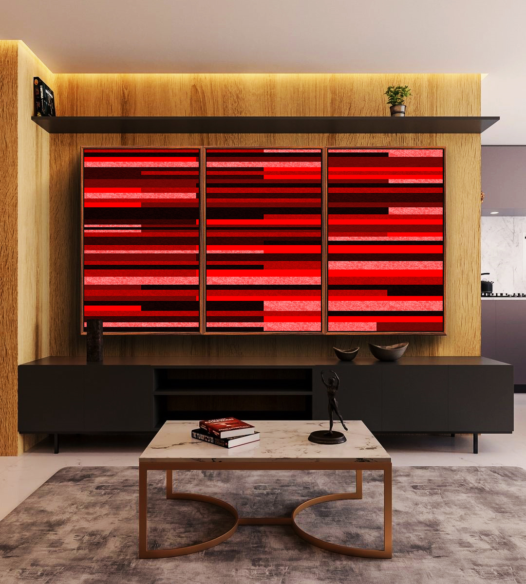 O mosaico geométrico em vermelho vinho e preto cria um abstrato elegante e expressivo. Este Trio de Quadros é a escolha ideal para salas, quartos ou escritórios, adicionando profundidade, contraste e um visual contemporâneo à decoração.
