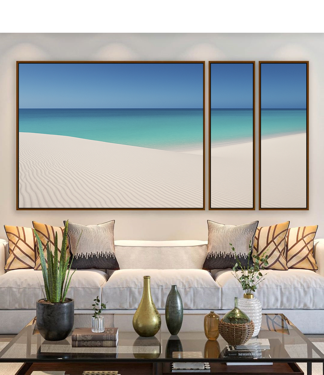 Sereno e sofisticado, este Trio de Quadros Estilizados retrata a harmonia entre céu azul, mar tranquilo, praia clara e dunas suaves. Ideal para valorizar salas refinadas, quartos elegantes, escritórios contemporâneos e bem iluminados.