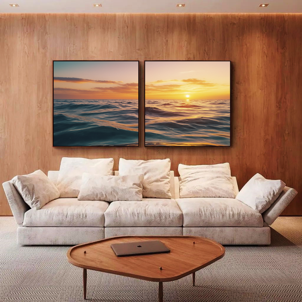 Com tons naturais e movimento suave do mar, este Duo de Quadros Quadrados de pôr do sol cria um ponto focal elegante e relaxante. Ideal para compor salas contemporâneas, quartos sofisticados, escritórios profissionais ou halls de entrada marcantes.
