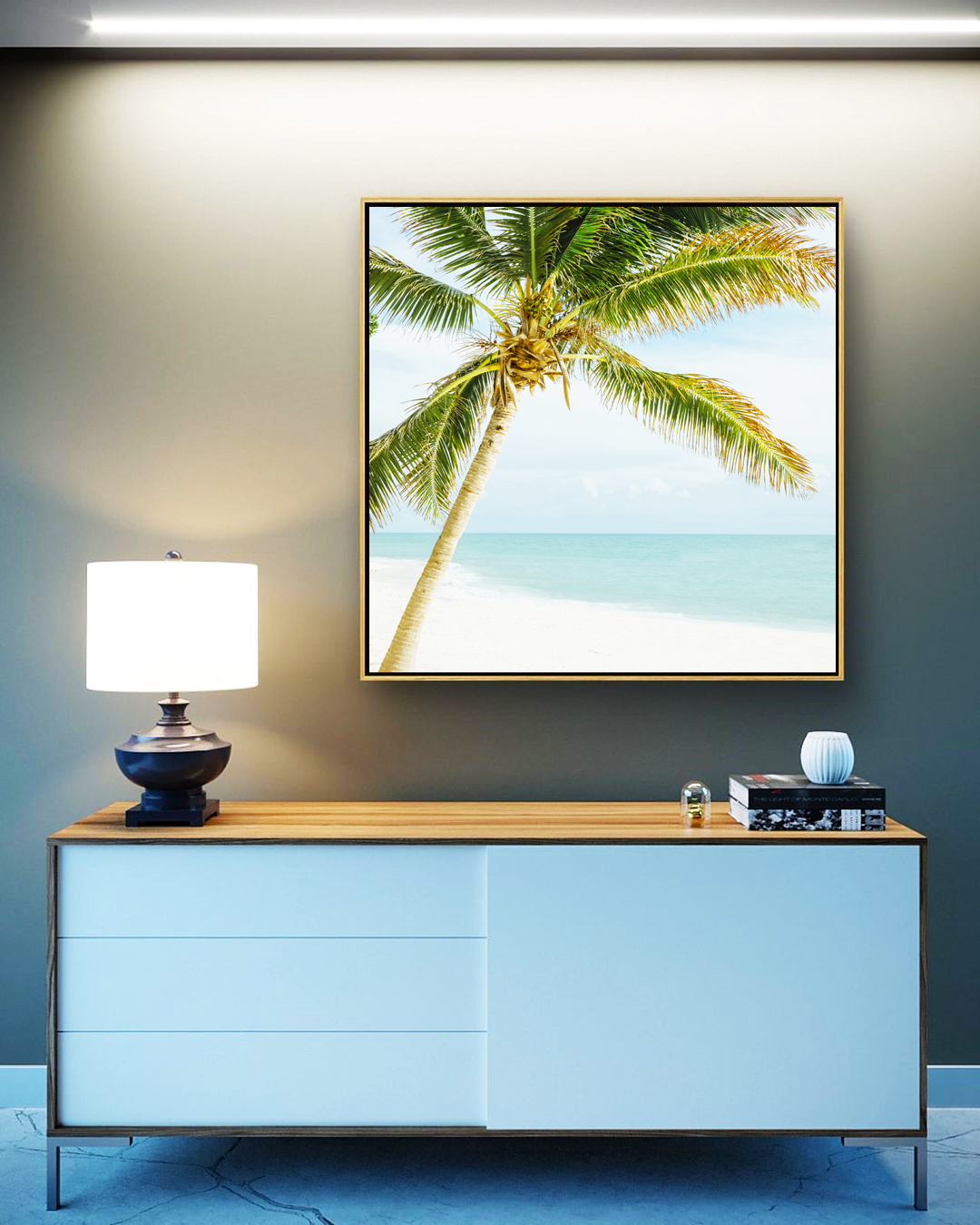Inspire-se na natureza com este Quadro Quadrado de coqueiro em praia paradisíaca. O mar azul turquesa e o céu ensolarado trazem leveza e aconchego ao ambiente. Impressão de alta qualidade sobre tela canvas com moldura sofisticada e resistente.