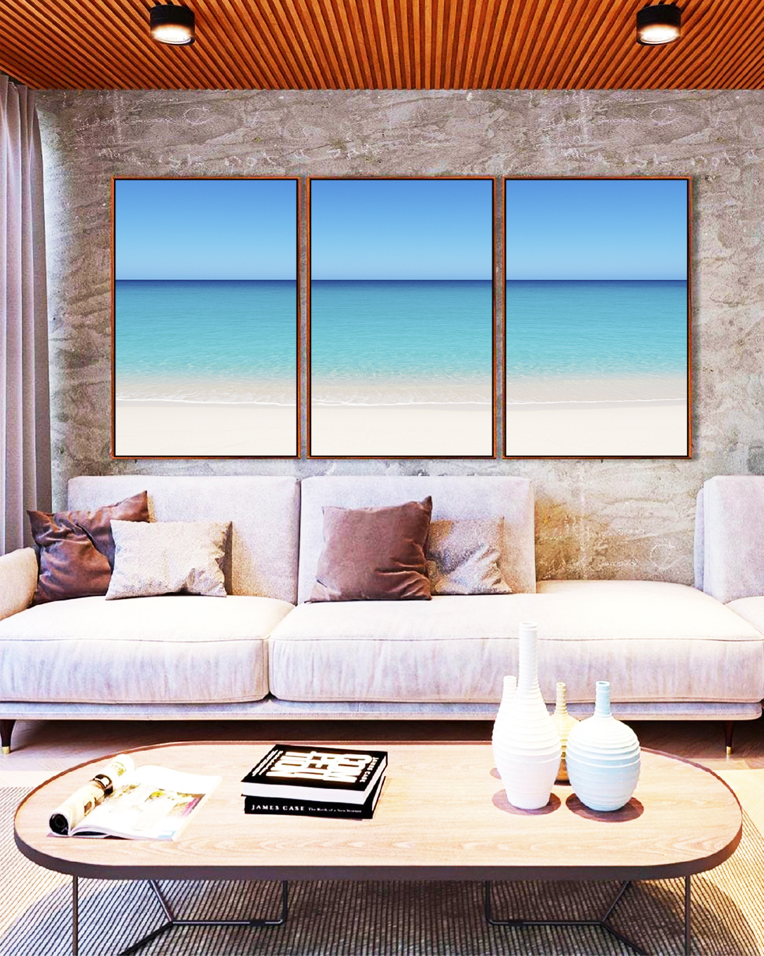 Este Trio de Quadros retrata a serenidade do mar azul e o brilho do céu limpo, evocando calma e harmonia. Perfeito para transformar salas, escritórios ou quartos em espaços relaxantes e elegantes.