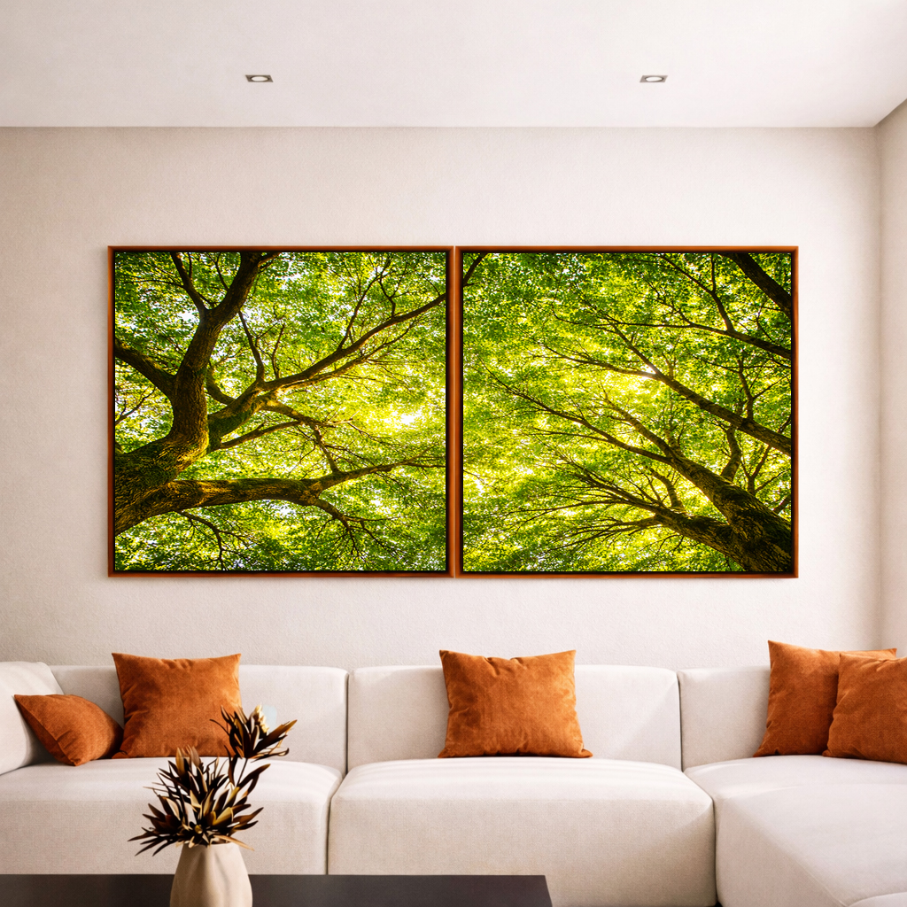 Duo de Quadros Quadrados Paisagem Céu Árvores Folhas Galhos Equilibrados Natureza Canvas Moldura
