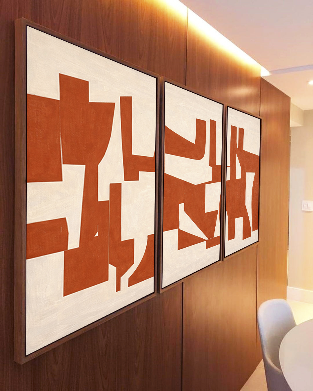 Trio de Quadros Abstrato Traços Minimalistas Geométricos Laranja Marfim Canvas Moldura