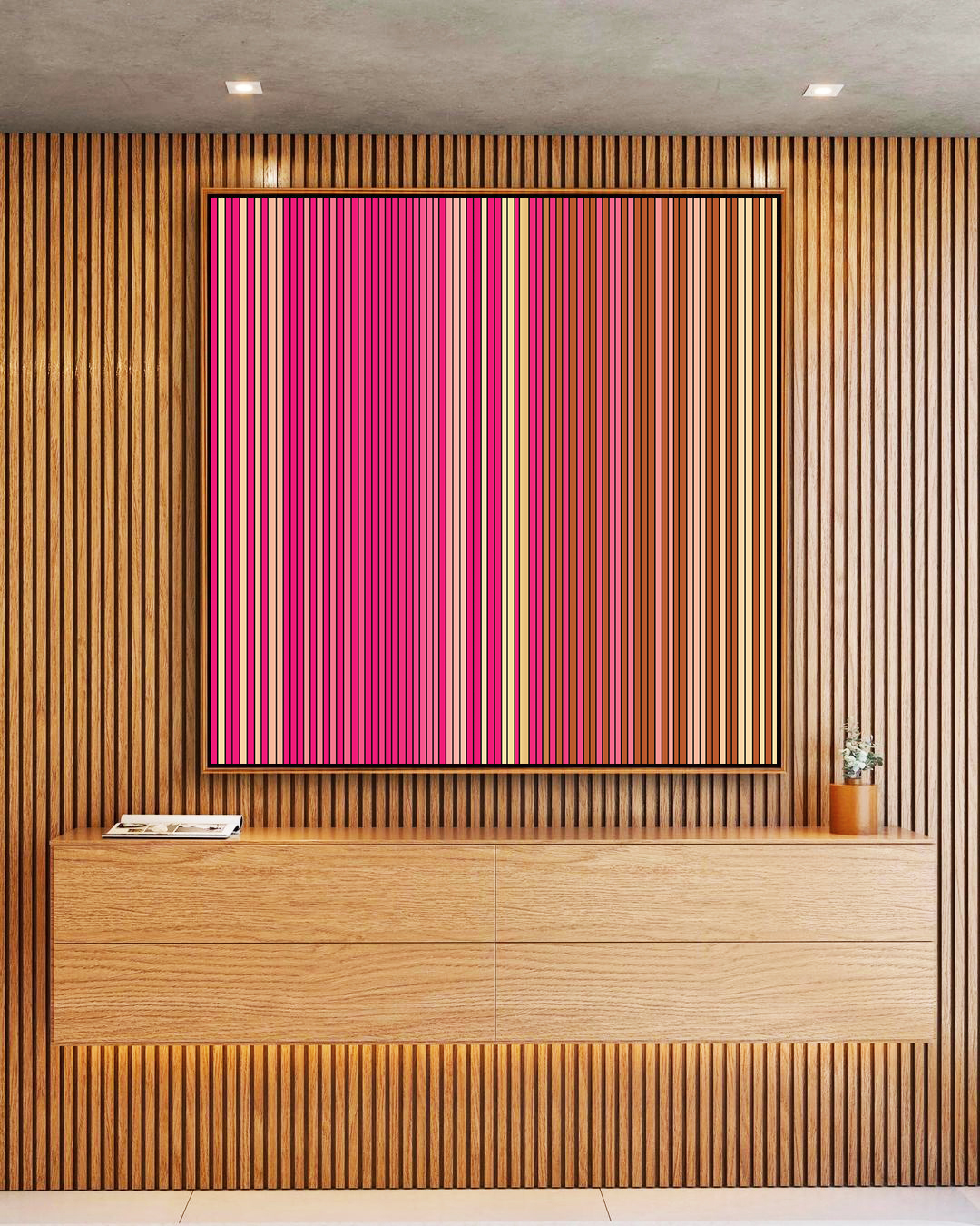 Estilo e personalidade em um só quadro! O design quadrado com listras geométricas em rosa choque, bege e caramelo ganha destaque com moldura extra fina flutuante. Indicado para decorar salas, quartos ou escritórios com toque artístico e moderno.