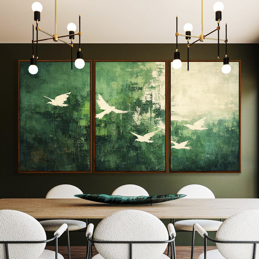 Pássaros voando sobre fundo verde com textura abstrata criam sensação de liberdade, leveza e tranquilidade. Estilo moderno e elegante que valoriza a decoração com suavidade. Perfeito para salas, quartos e escritórios.