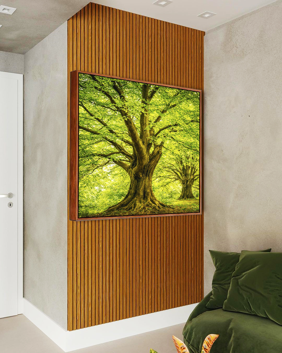 Árvores em meio à natureza iluminada, criando uma atmosfera leve e acolhedora. Ideal para sala, quarto ou espaços que pedem tranquilidade, frescor e conexão com o verde.