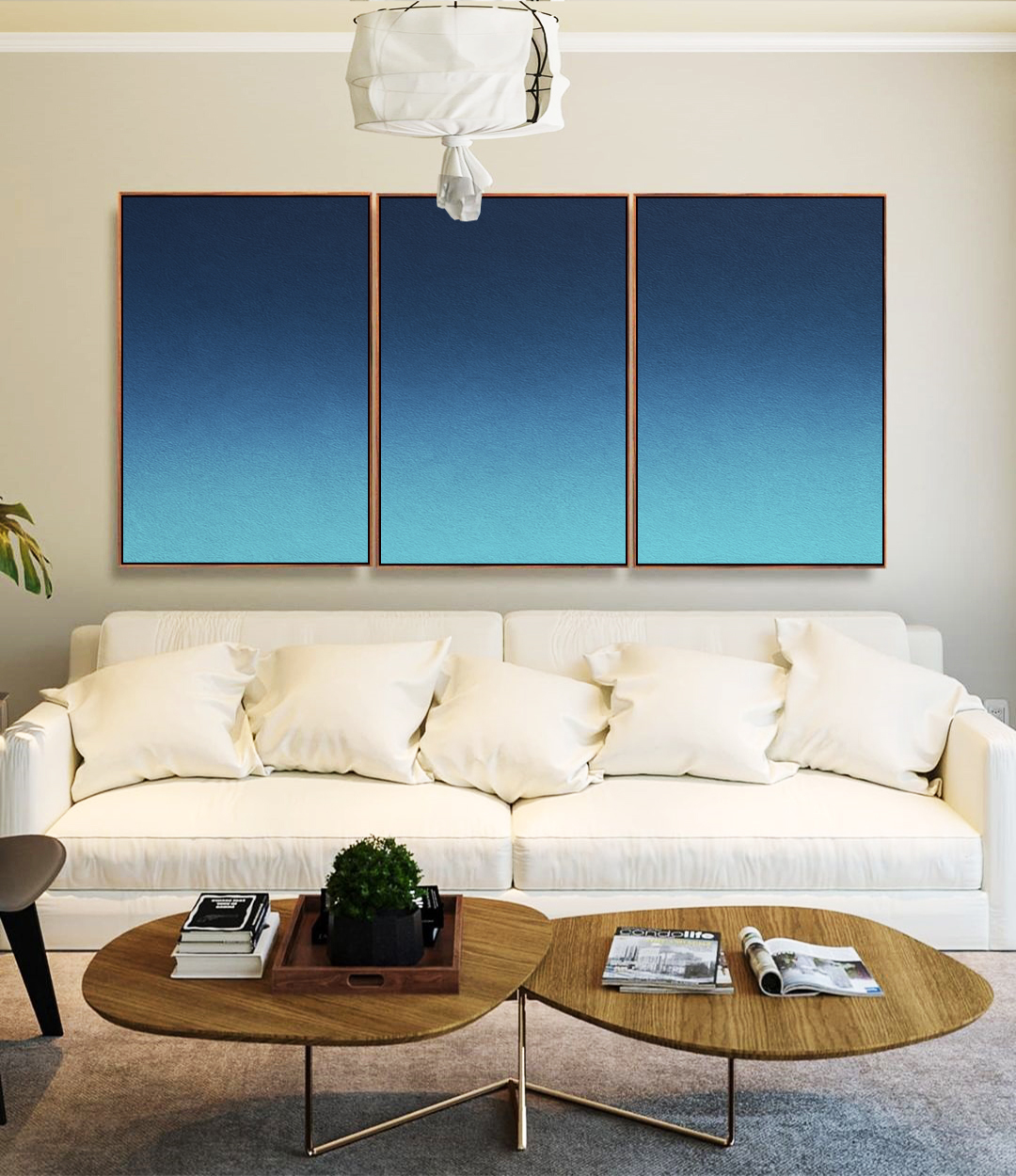 Elegante e envolvente, este Trio de Quadros com degradê em tons de azul apresenta textura delicada e visual equilibrado. Ideal para valorizar salas modernas, quartos elegantes, escritórios profissionais ou halls de entrada bem iluminados.