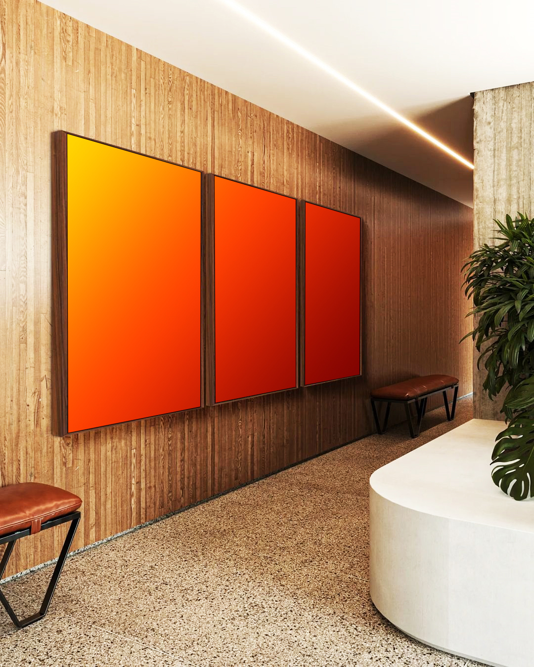 Torne seu espaço mais acolhedor com este Trio de Quadros abstrato degradê amarelo e laranja. O efeito de cores quentes e sofisticadas é ideal para salas, quartos e escritórios. Impressão em canvas de alta qualidade com moldura elegante.