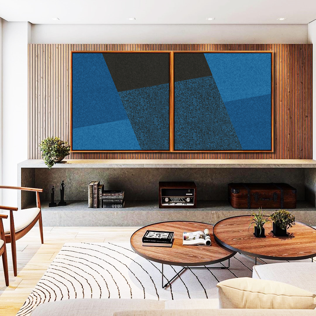 Moderno e sofisticado, este Duo de Quadros Quadrados geométrico em degradê azul cria profundidade e equilíbrio visual no ambiente. A escolha ideal para salas elegantes, quartos refinados, escritórios contemporâneos.