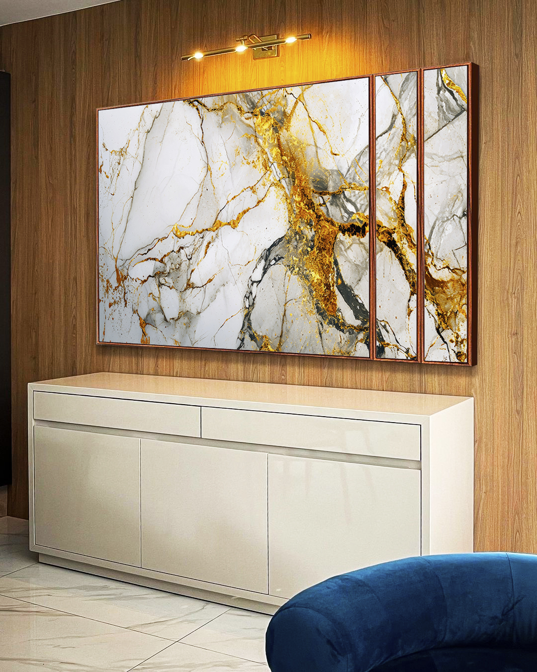 Expressão e sofisticação neste trio estilizado de arte fluida. Os traços abstratos em branco, dourado e cinza criam impacto em salas modernas, halls imponentes ou escritórios requintados. Moldura moderna flutuante em canvas artístico.