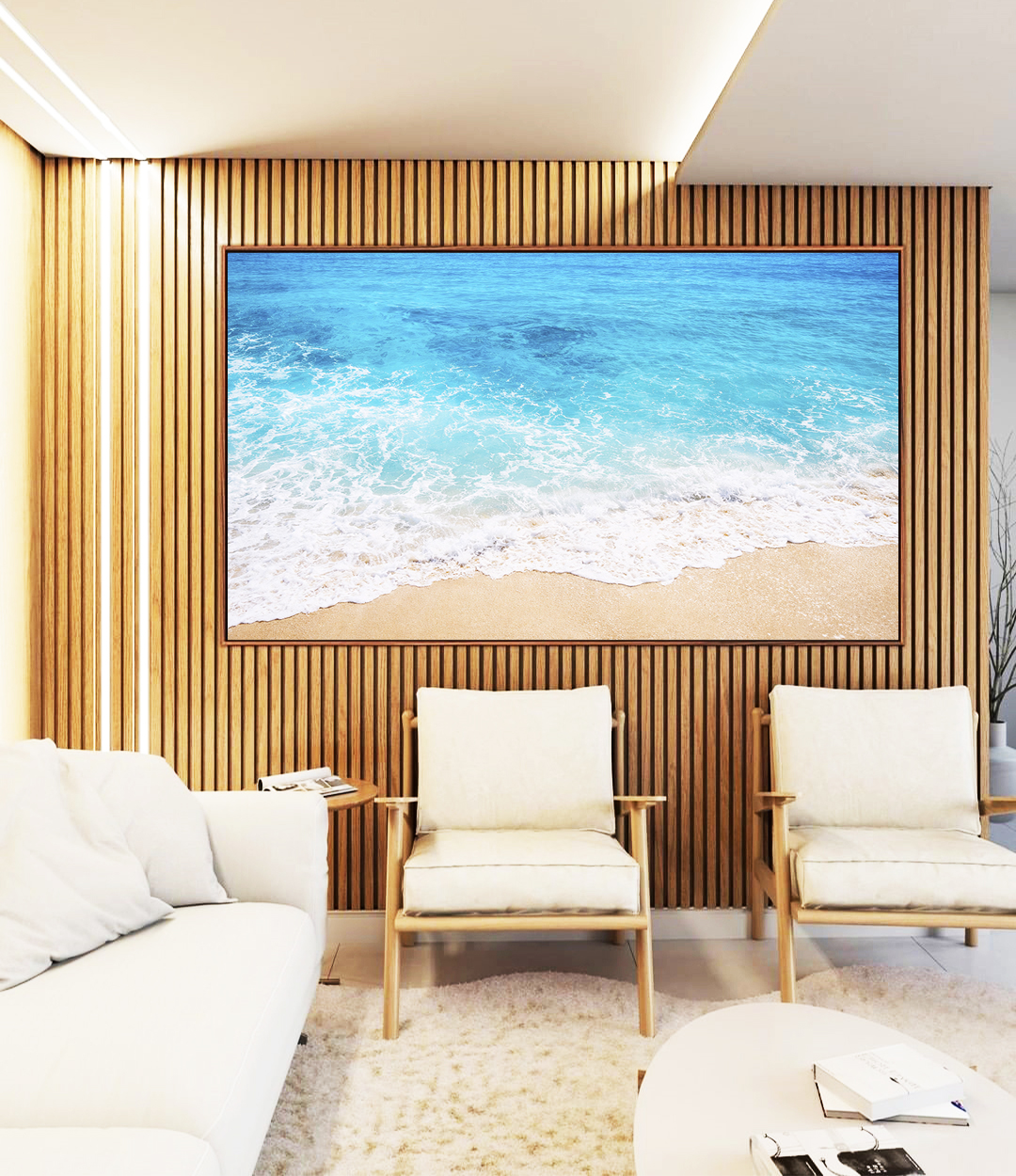 Praia com mar cristalino, reflexos do sol e espuma delicada na areia. Perfeito para ambientes como sala, quarto, escritório ou espaço comercial. Estilo natural e sofisticado que valoriza a decoração com leveza e luz.