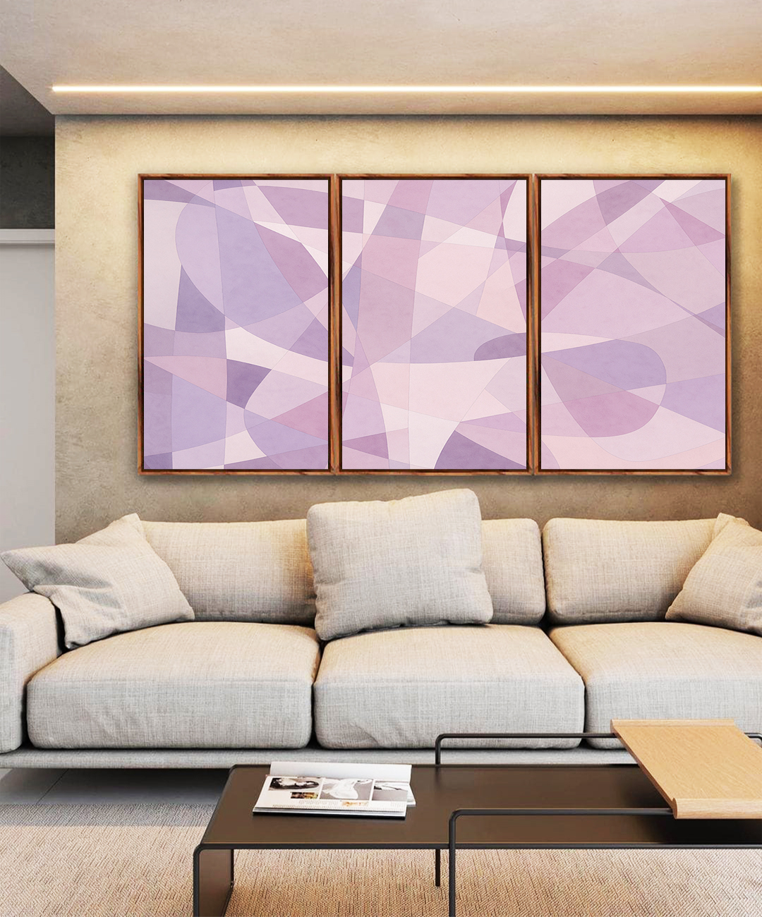 Trio de Quadros que une tons de roxo, lavanda, rosa e branco em mosaico abstrato harmonioso. Moldura moderna realça o conjunto. Ideal para sala, quarto ou escritório, criando ambiente sofisticado e de grande impacto visual.