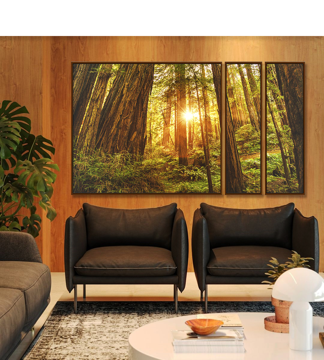 A beleza da natureza ganha destaque neste Trio de Quadros Estilizados que retrata uma floresta iluminada pelos raios de sol. Uma arte encantadora que transmite serenidade e harmonia, ideal para decorar sua sala, quarto ou hall de entrada com elegância.