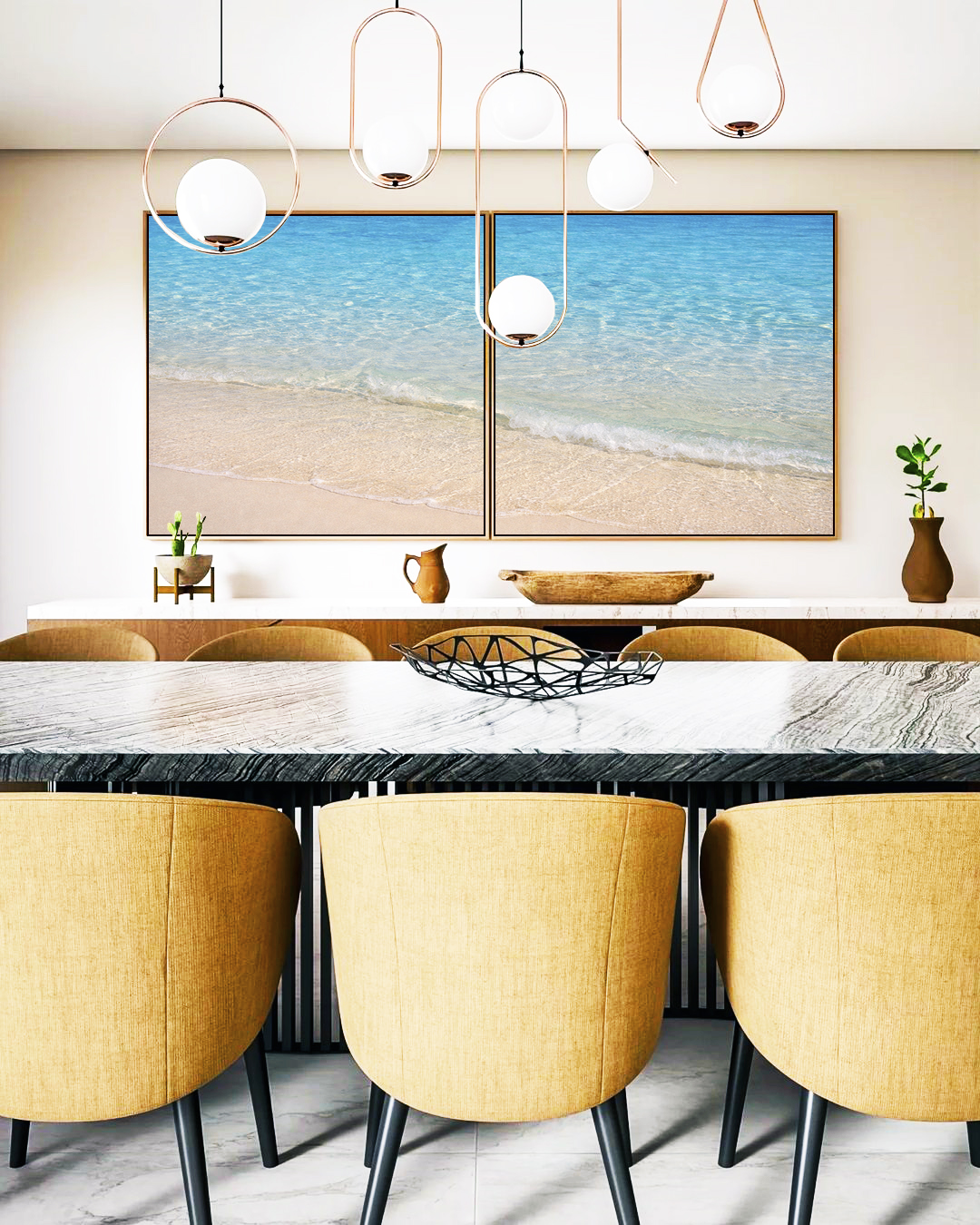 Praia branca e luminosa com mar azul claro cria uma atmosfera leve e relaxante. Ideal para salas, quartos e ambientes que buscam frescor, tranquilidade e sensação de descanso à beira-mar.