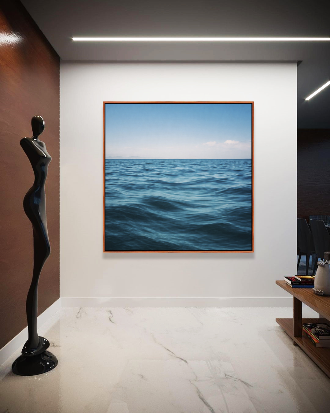 Mar azul profundo com ondas suaves e céu sereno formando cenário de tranquilidade e elegância. Ideal para ambientes como salas de estar, quartos, escritórios ou halls. Decoração inspirada na natureza, oceano e paisagem marítima.